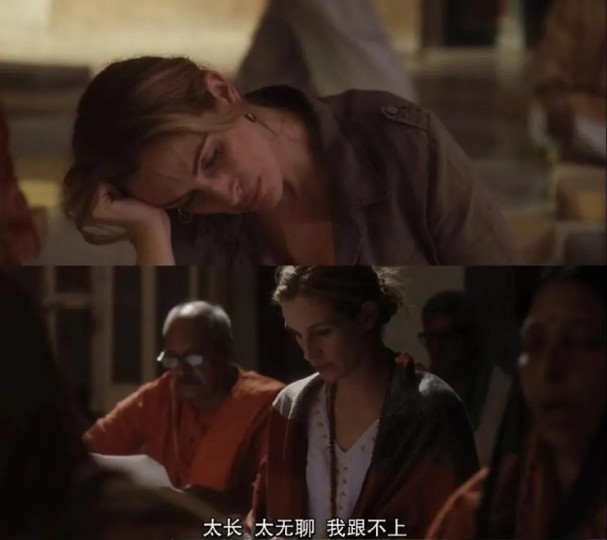 她注意到这里的人很多都在胸上都有“silence”(静默)的牌子,她的导师告诉她,静默是最好的修行。在灵修所,她每天进行大量的冥想、祈祷,也开始尝试静默,她常常在冥想中不知不觉地睡着,思绪也总是如脱缰野马般四处乱飞——一会儿是未完成的工作,一会儿是下一次旅行的目的地。这正是许多初学者在冥想中都会遇到的困境:当试图让内心平静时,大脑反而会变得异常活跃。