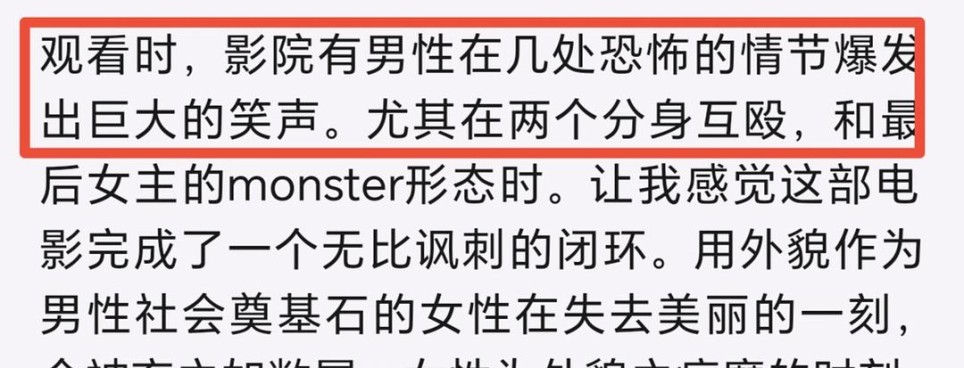 **二、关于本片的“男性凝视”** 可能有人会认为,女导演不应该拍出“以男凝反讽男凝”的作品,评论区也有很多人在骂本片“男性凝视”,这就很难不反驳了。 虽然这种表现手法的确比较先锋也颇有争议,但这些观众也太苛刻了,难不成要男导演来拍你们就能接受了??还是说这些观众认为,女导演应该拍“女凝”?(不是我胡扯,本人确实看过女凝的影片)。 对于《某种物质》因“男性凝视”而被诟病,我是不认同的,近年来,很多好片被一些人逐帧剖析之后扣上“男凝”的帽子,个人感觉这就是找不到缺点然后尬黑的表现,我本人也是比较反感男凝的,但不应该以此为借口去随意玷污一部好作品。 与此同时,还看到一些评论说,在演到母体和完美体互殴的片段时,很多男性观众都在大笑。